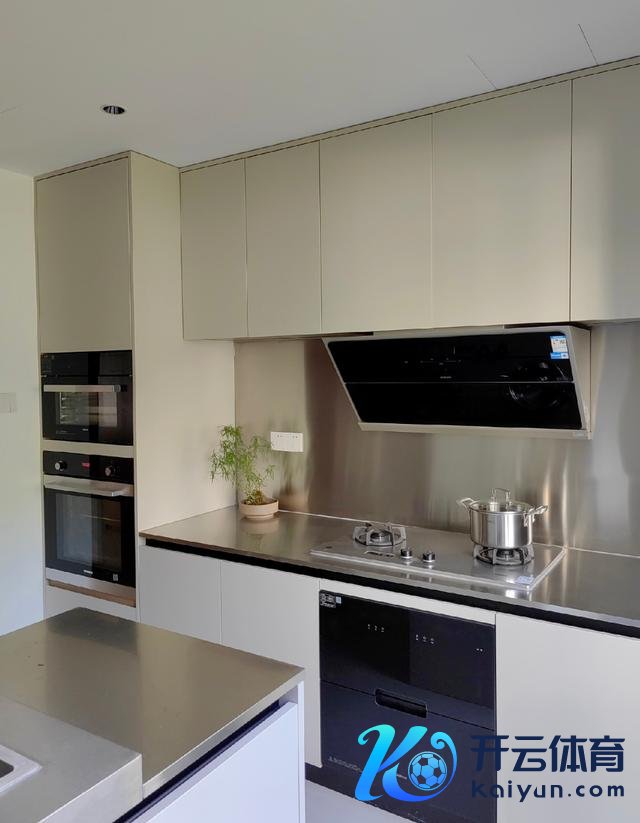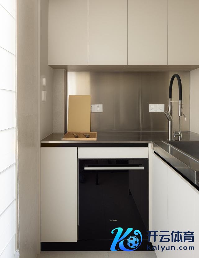 L型的橱柜布局,充分校服了东谈主性化的操作动线,而且再次加多了一个水槽,让生计更有成果。而调和的不锈钢台面和墙面缱绻,渊博收拾起来也极为毛糙。