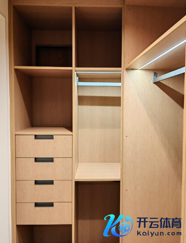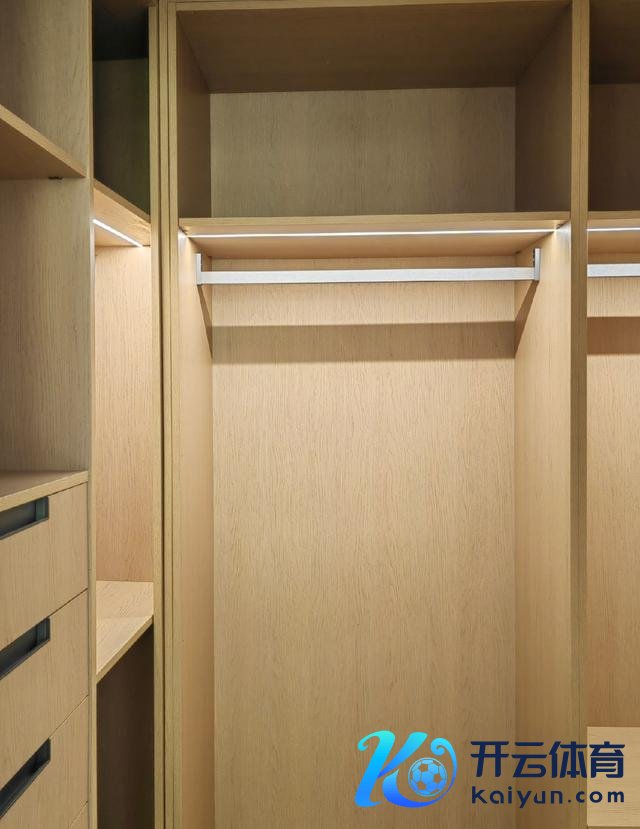 诈欺过谈面积连络的衣帽间,炫耀了U型衣柜布局,而且在柜体结构缱绻上,都是按照屋主的收纳民风缱绻的。