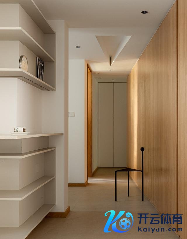 虽说客厅的布局废弃了电视机,但推敲到偶尔的不雅影需求,照旧在顶面预留了投影幕布位置,继而完善了空间的功能性。