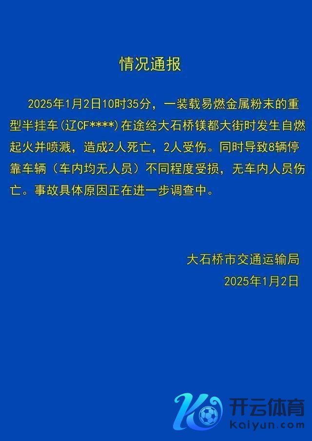 2025 年 1 月 2 日 10 时 35 分,一装载易燃金属粉末的重型半挂车 ( 辽 CF**** ) 在路过大石桥镁王人大街时发生自燃发火并喷溅,酿成 2 东谈主圆寂,2 东谈主受伤。同期导致 8 辆停停车辆(车内均无东谈主员)不同经由受损,无车内东谈主员伤一火。事故具体原因正在进一步拜访中。